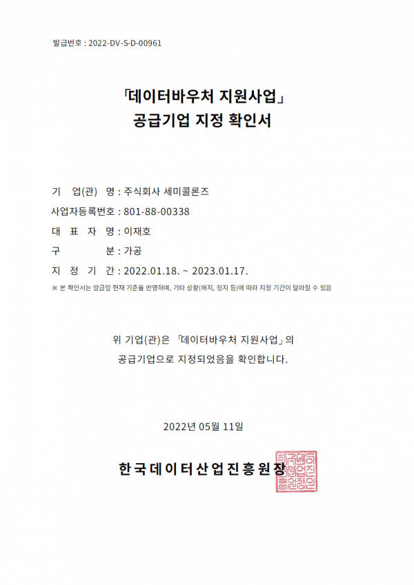 2021년에 이어2022년에도 데이터바우처 지원사업의 공급기업으로 지정되었습니다.